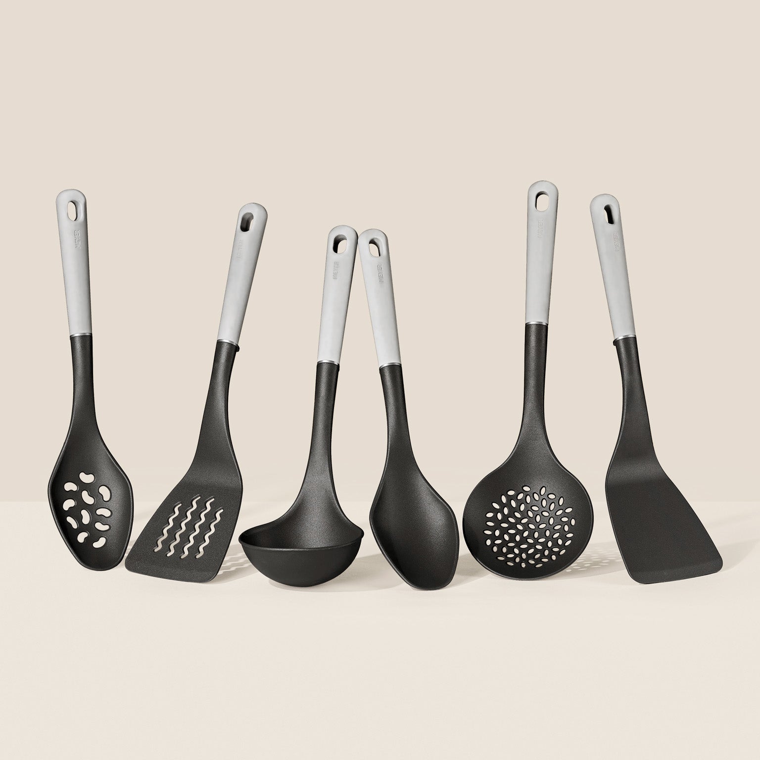 A clever stainless steel stopper feature makes sure these tools stay put so they don't slide into your pots and pans and become a mess to handle. It also helps resist scorching if the tool is left on a hot rim.