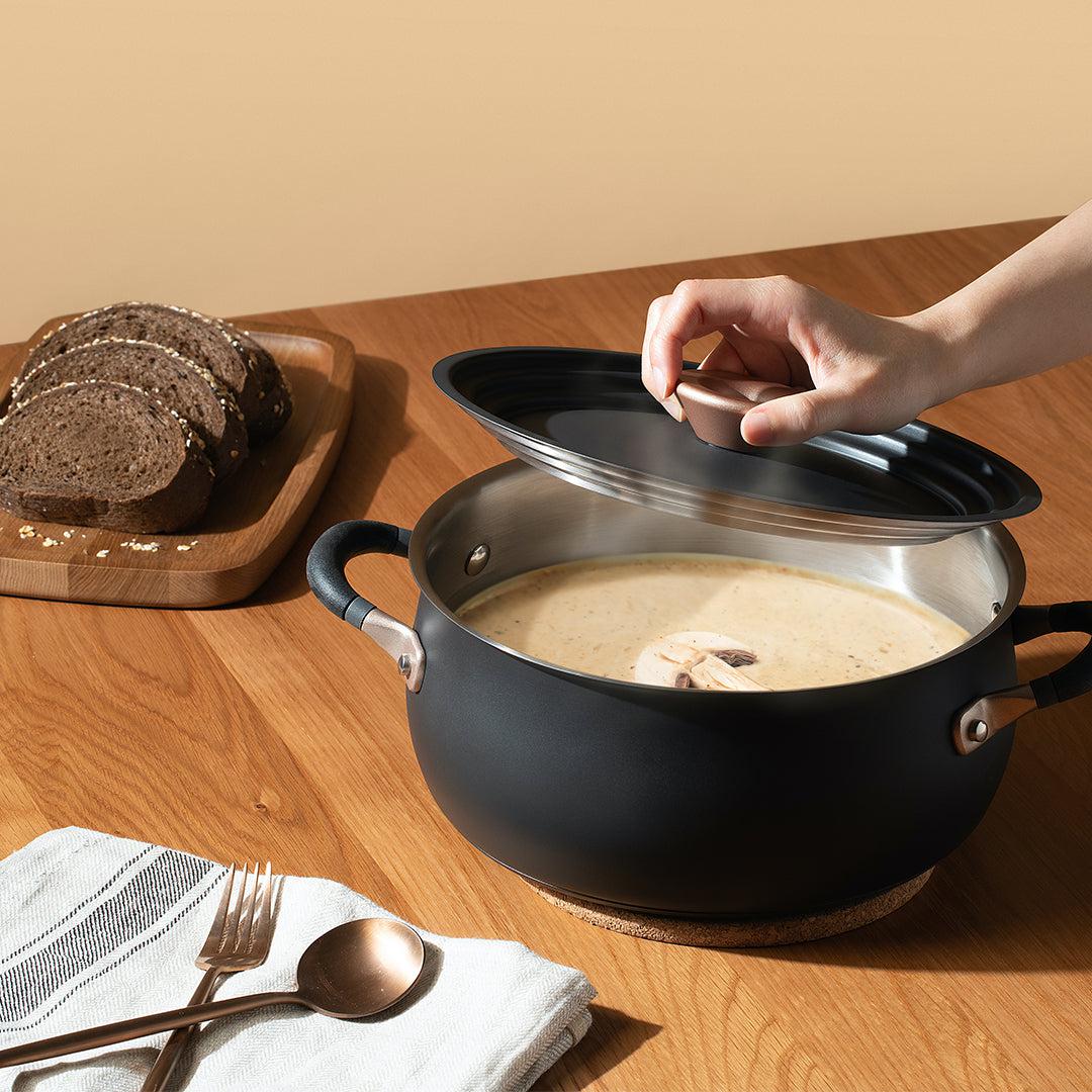 The stockpot and lids are made from heavy gauge, premium white stainless steel makes for the best performance in boiling and steaming. The handles are made from a special high temperature silicone for added comfort, oven-safety, and finger-protecting insulation. The pans are finished with a high-heat, oven-safe matte black exterior and stainless steel induction bases.