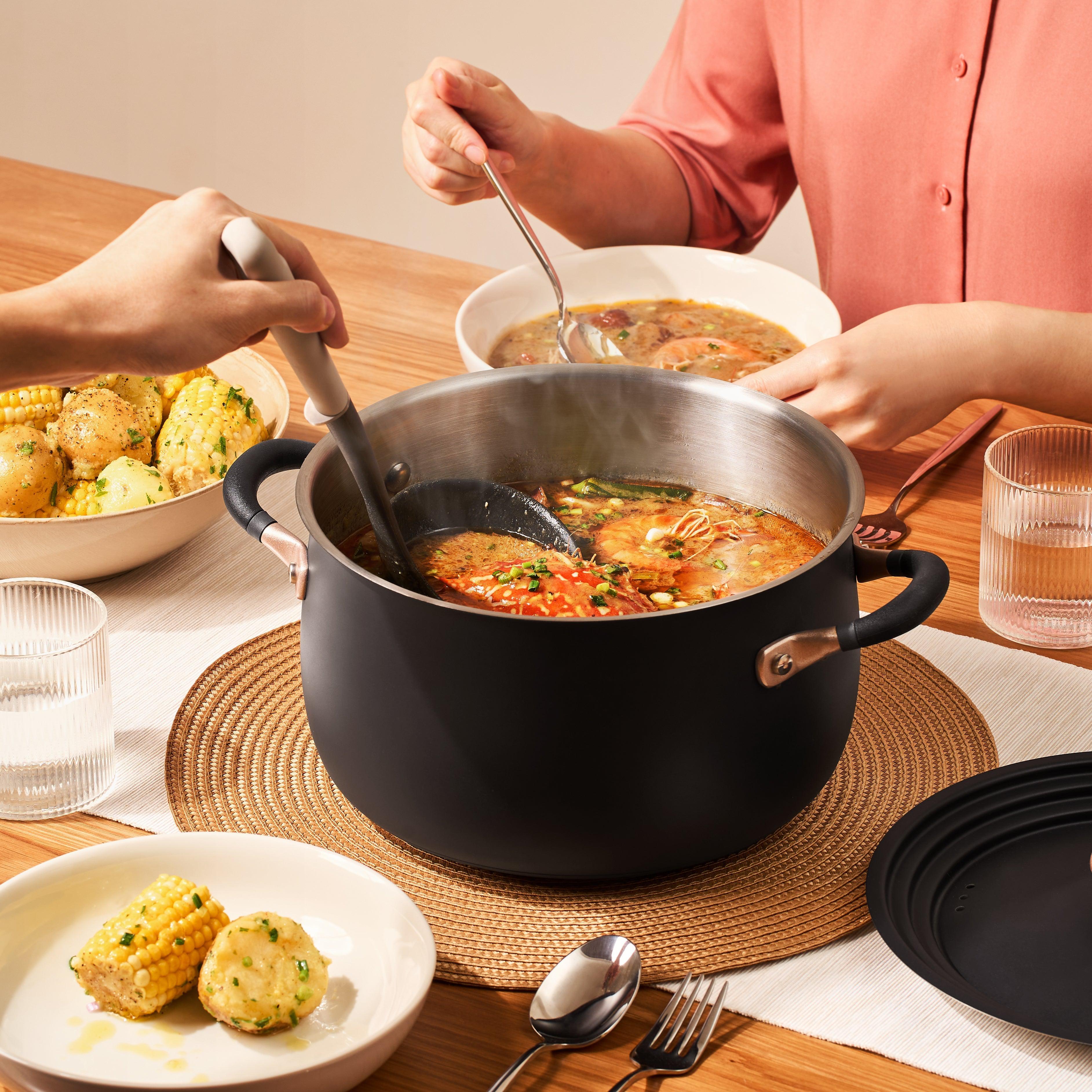 Gosh, what a stunner! This boilover-resistant beauty is a great family-sized stockpot, perfect for stews, boiling and steaming veggies, big batches of pasta, and beyond. Built with heavy duty stainless steel that is 60% thicker than average, this hefty gal is designed to last a lifetime, and made without PFAS & BPA. Dishwasher & induction friendly.