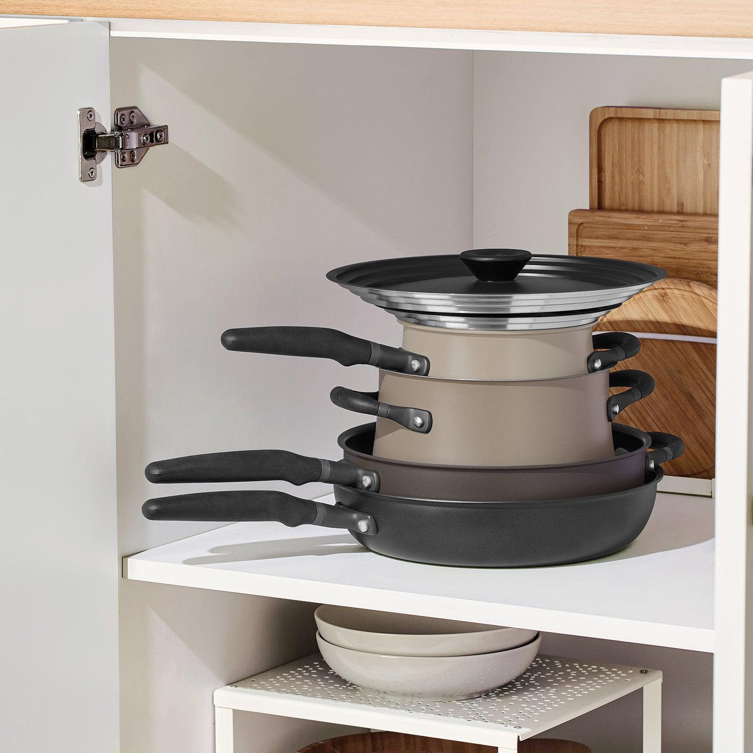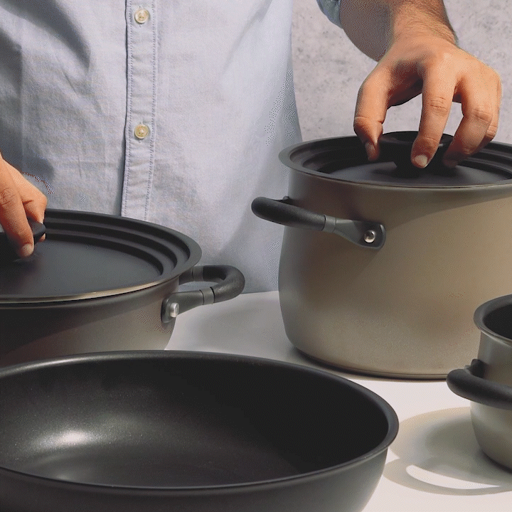 The Essential Set isn't just about cooking - it's about smart storage too. Every pan and pot is designed to fit together effortlessly, streamlining your storage. And with it's universal lid system, there's no more lid-hunting.
