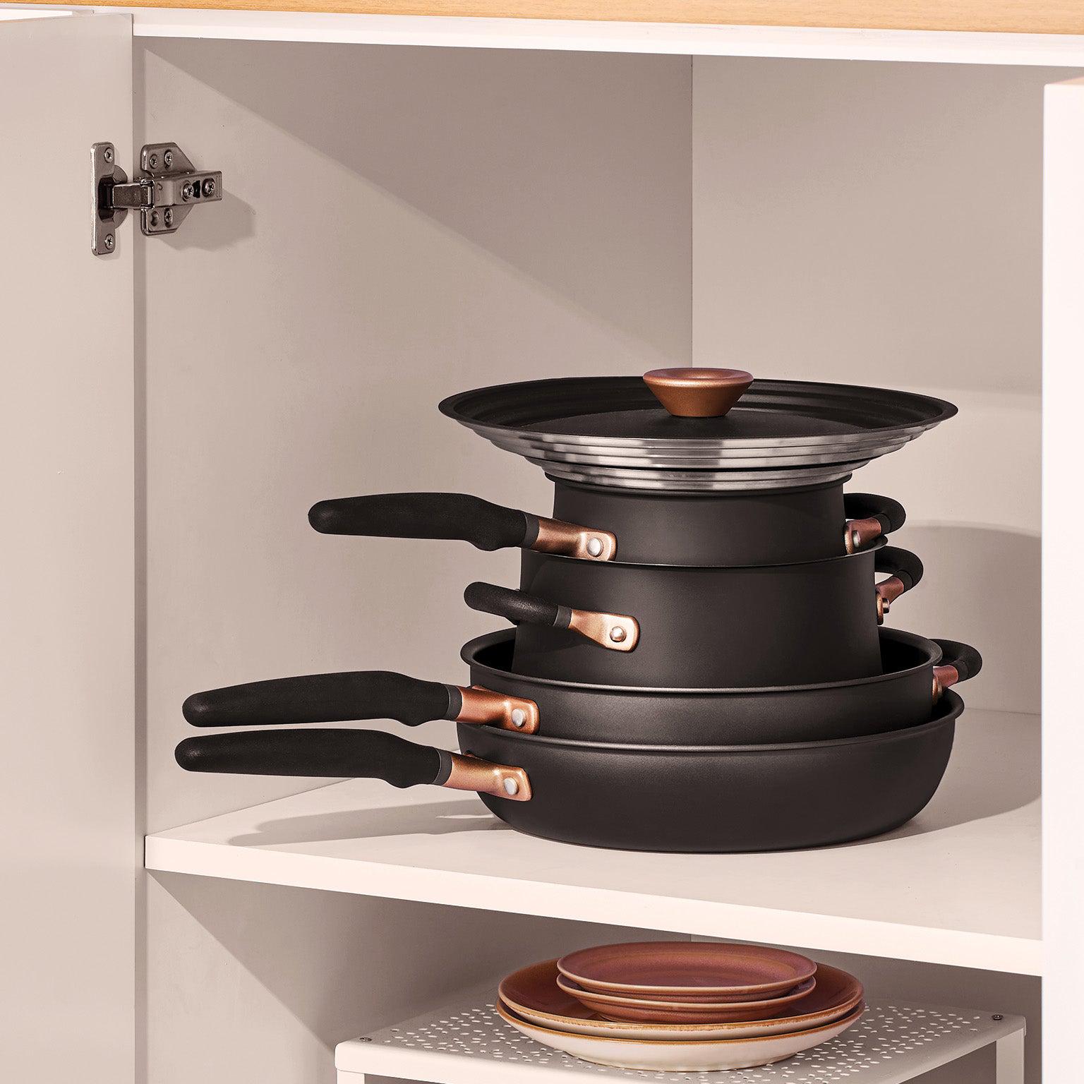 The Essential Set isn't just about cooking - it's about smart storage too. Every pan and pot is designed to fit together effortlessly, streamlining your storage. And with it's universal lid system, there's no more lid-hunting.