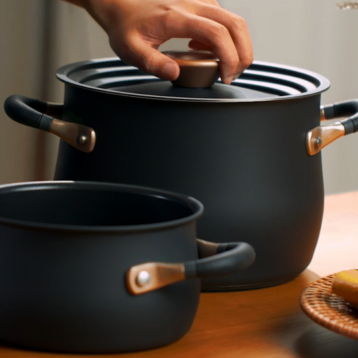 Our innovative "electric bath" technique gives the Essential Set a resilient black alumite coating. This not only protects the nonstick surface from scratches but also guarantees a lasting bond between the nonstick layer and the pan.